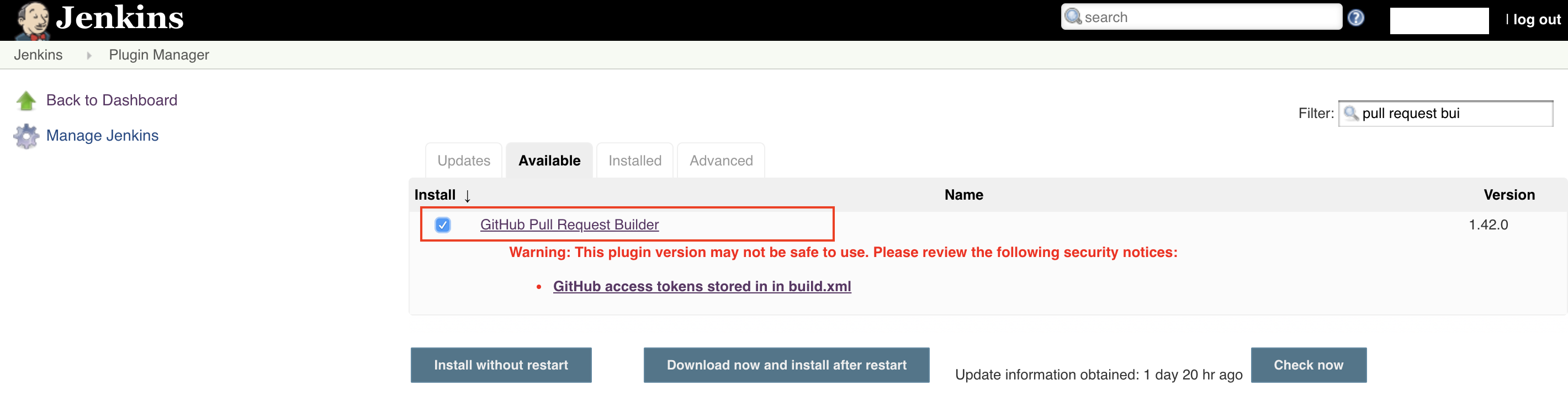 打开Available页面,选择Github Pull Request Builder,点击Install without restart按钮