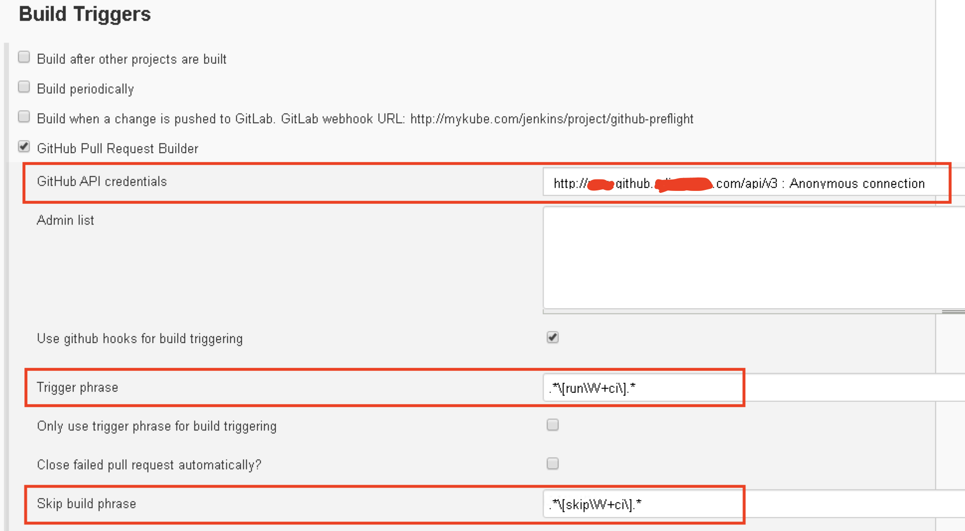 - Skip build phrase: 在合并请求(pull/merge request)的注释或标题里加入skip build phrase内容则不会触发构建