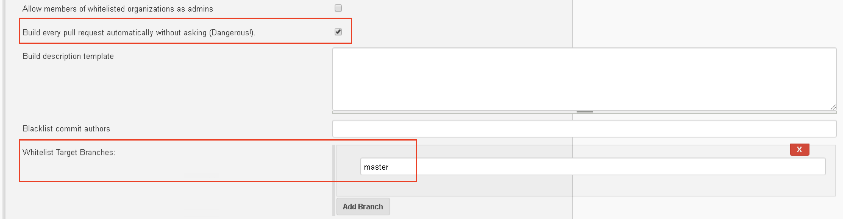 如果需要构建每个合并请求(pull/merge request),勾选”Build every pull request automatically without asking (Dangerous)”,在”Whitelist Target Branches”输入主分支”master”
