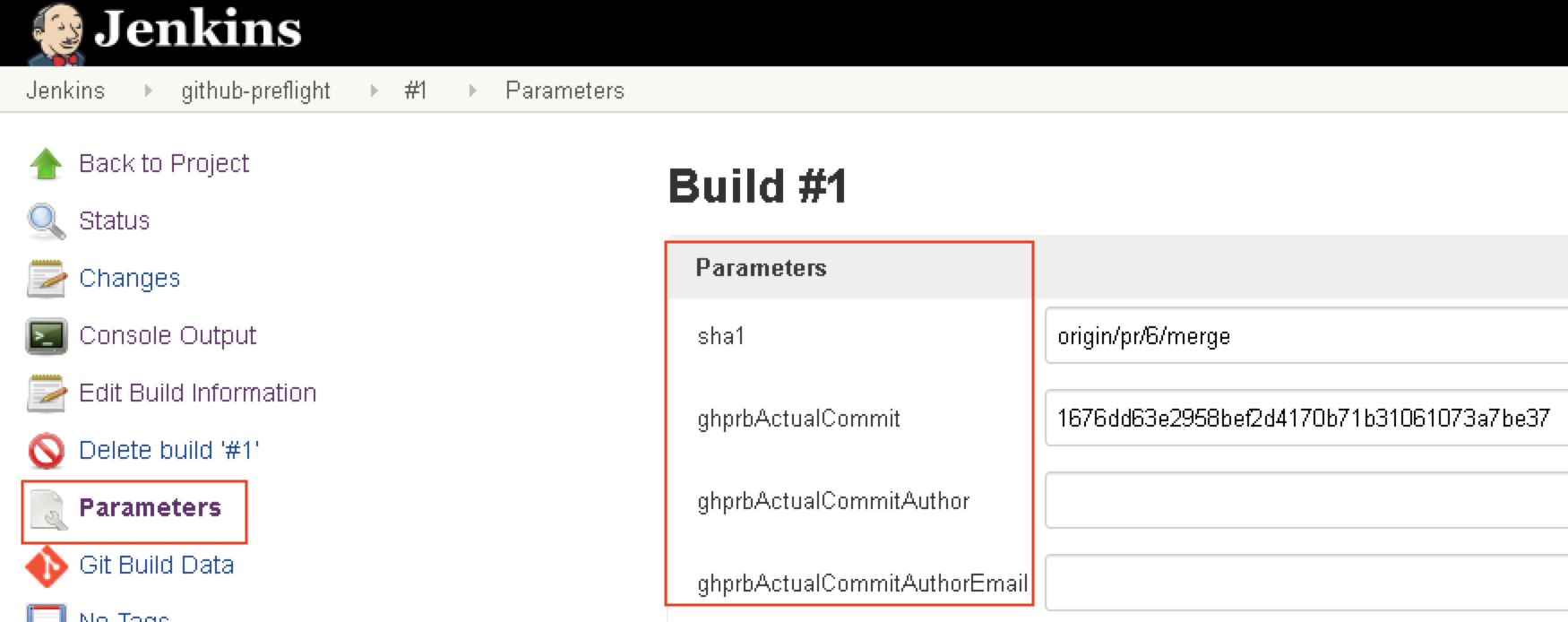 | sha1 | origin/pr/6/merge | 合并请求(pull/merge request)分支。在构建Job中也可以用${sha1}来代替${ghprbActualCommit} |