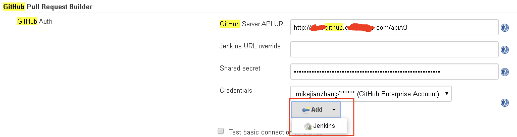 定位到”Github Pull Request Builder“插件,点击Add菜单打开创建Jenkins认证信息对话框