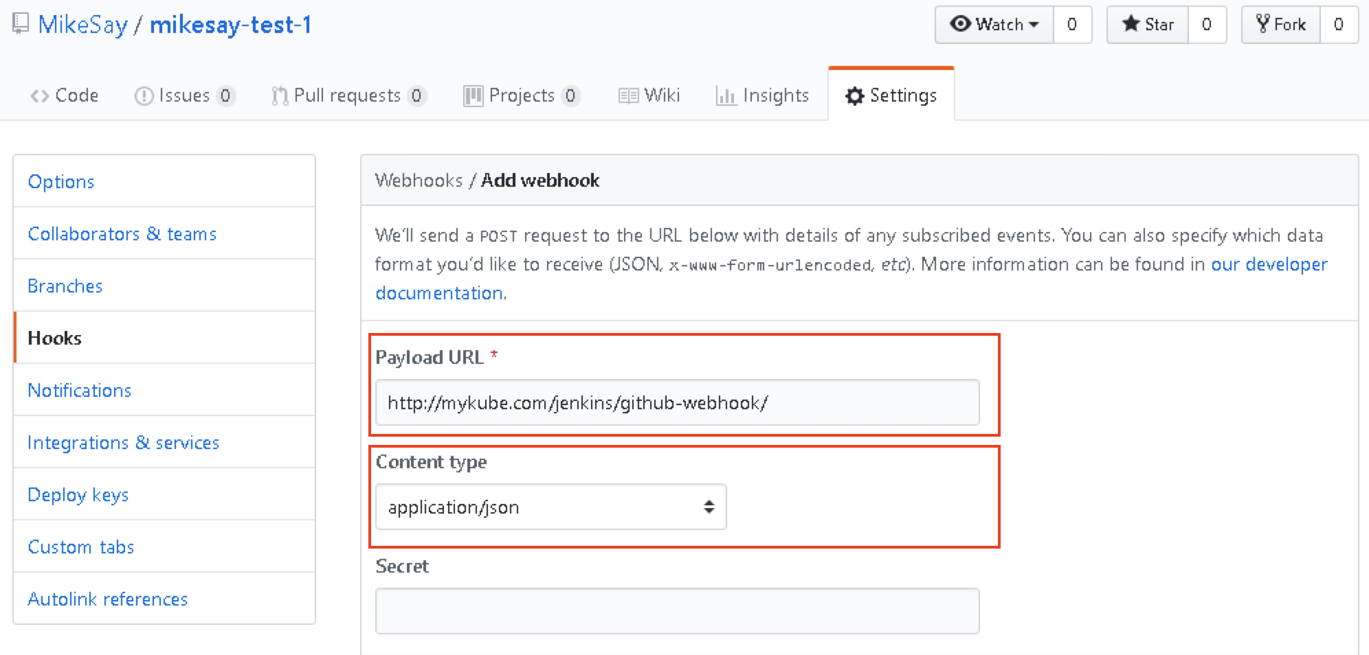 http://jenkins-url/github-webhook/),选择Content Type为application/json