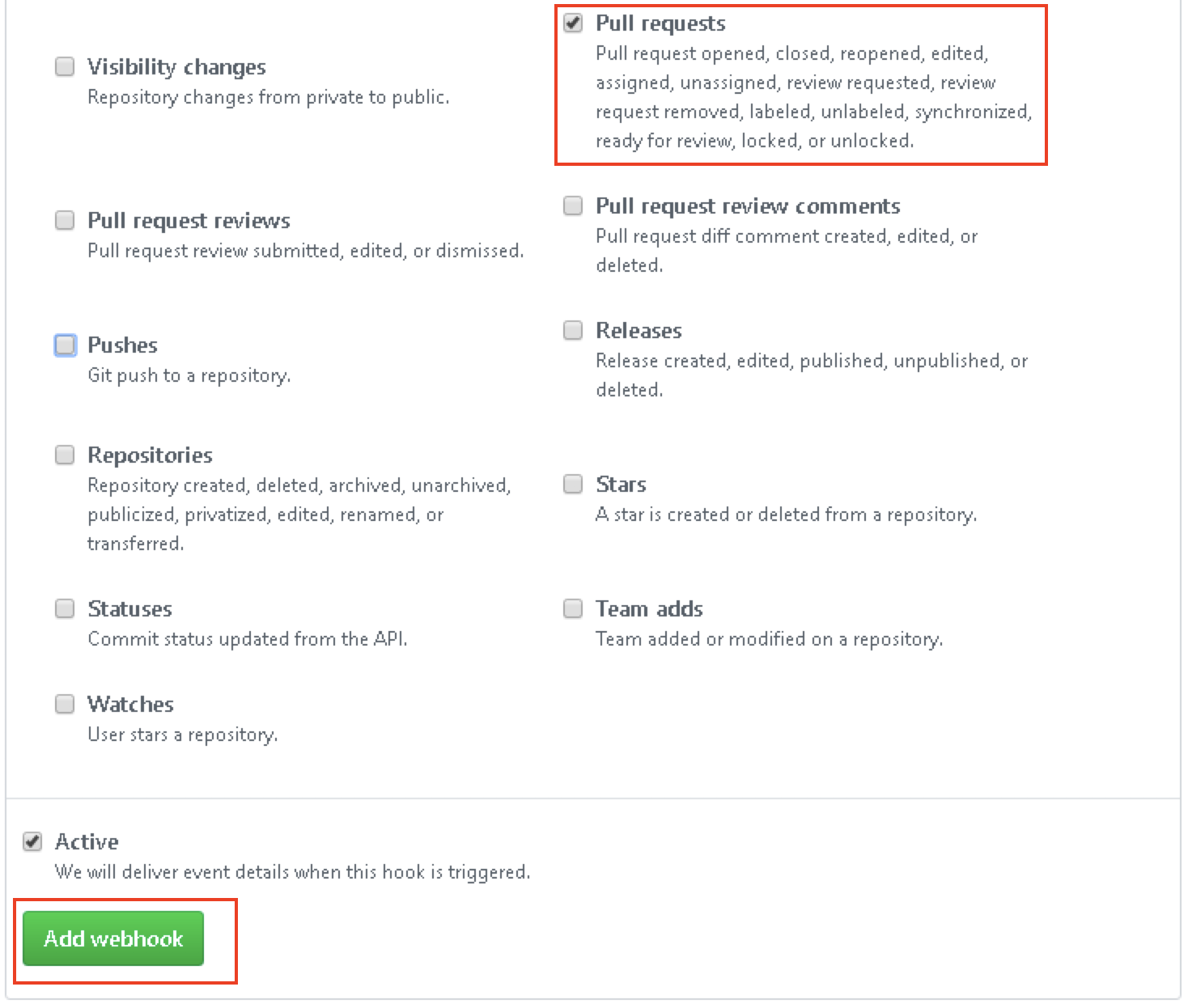 只选择”Pull requests”事件,并点击”Add webhook”保存Webhook