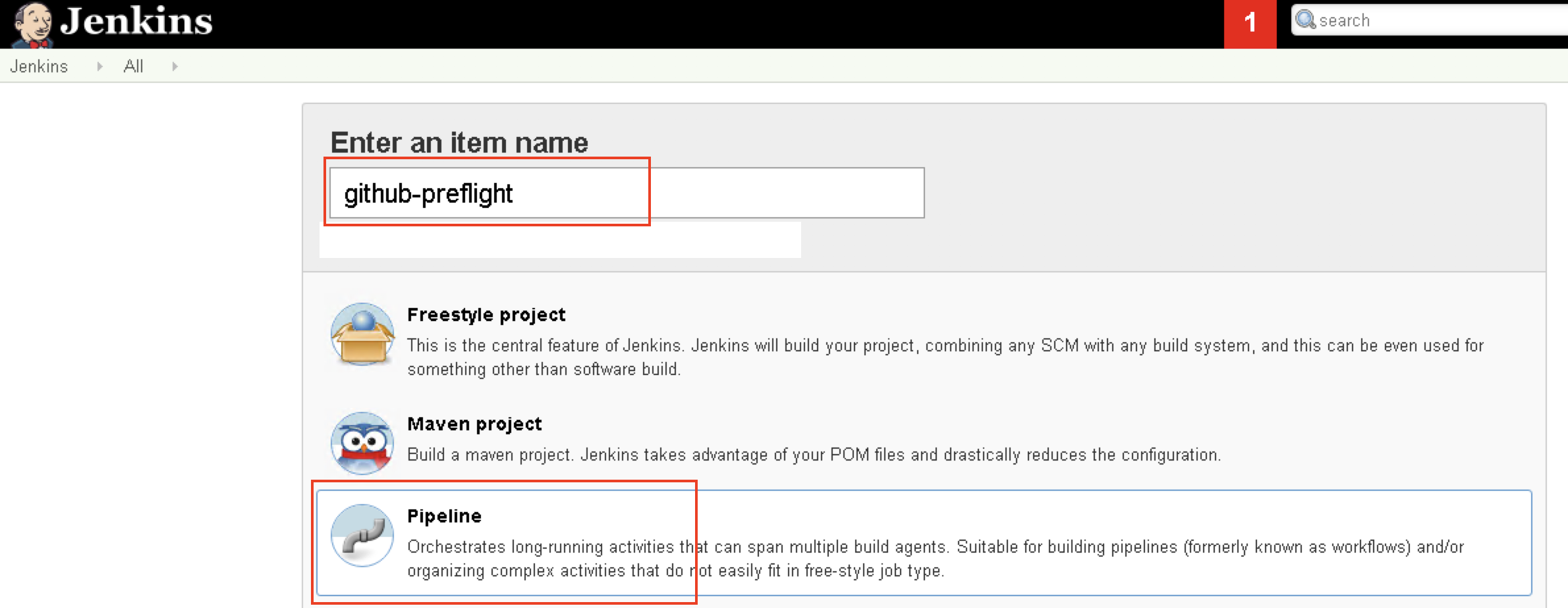 选择Job类型为”Pipeline”,输入Job的名字”github-preflight”,点击”Ok”按钮
