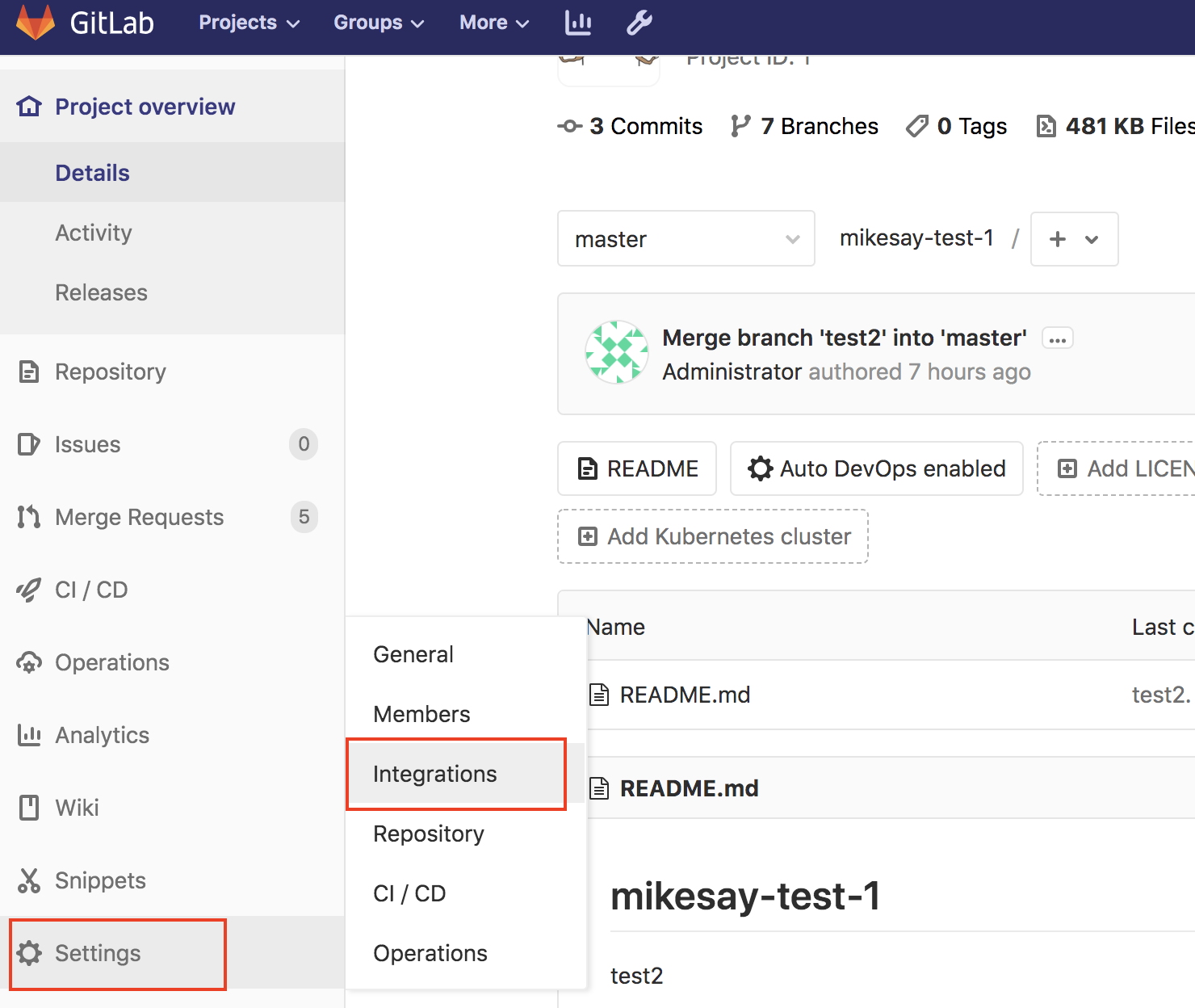 进入具体的项目页面,点击Settings -> Integrations打开创建Web hook的页面