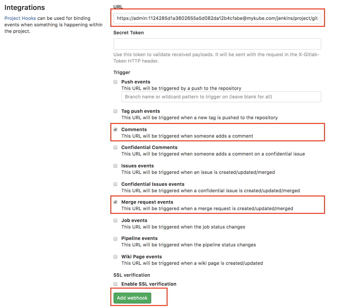在URL地址里输入Jenkins Gitlab插件生成的Web hook地址,包括Jenkins的认证信息,比如https://<jenkins user>:<user's api token>@mykube.com/jenkins/project/gitlab-preflight,选择”Comments”和”Merge request events”用来监听合并请求(merge request)事件,包括评论更新事件。