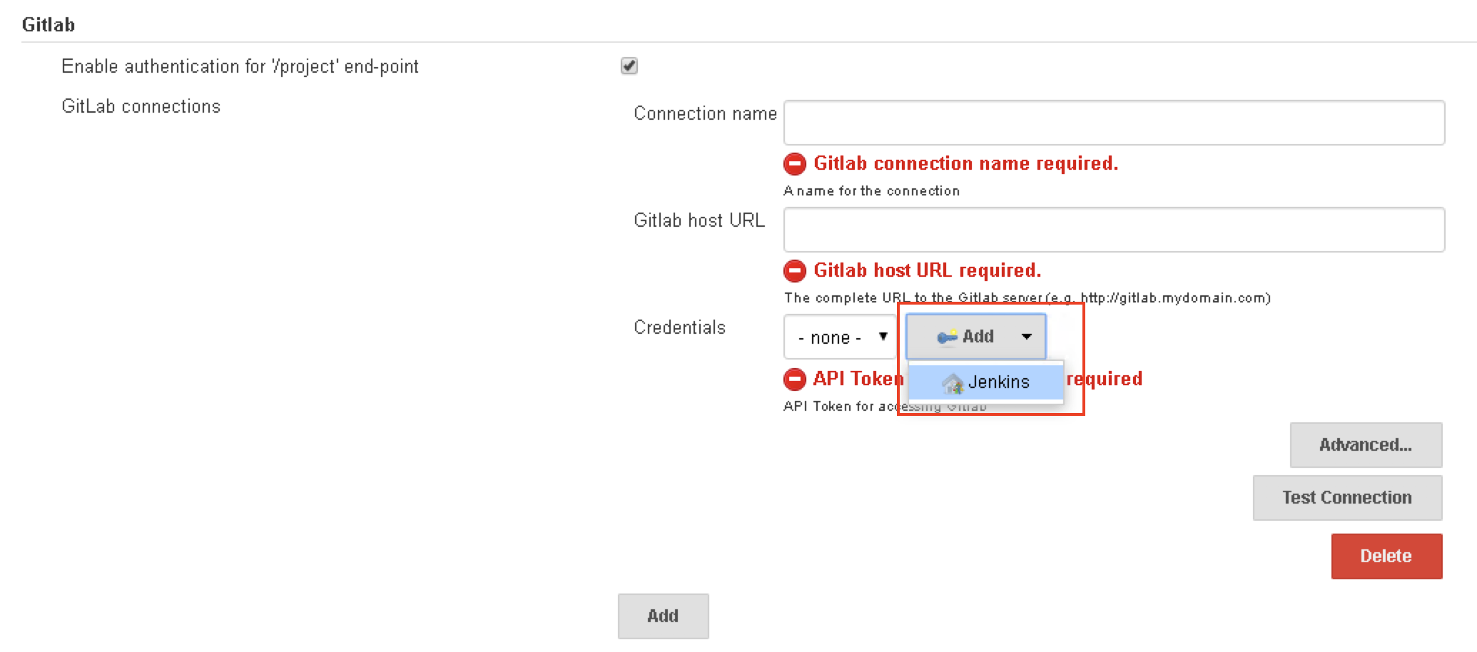 定位到”GitLab“段落,点击Add菜单打开创建Jenkins认证信息对话框
