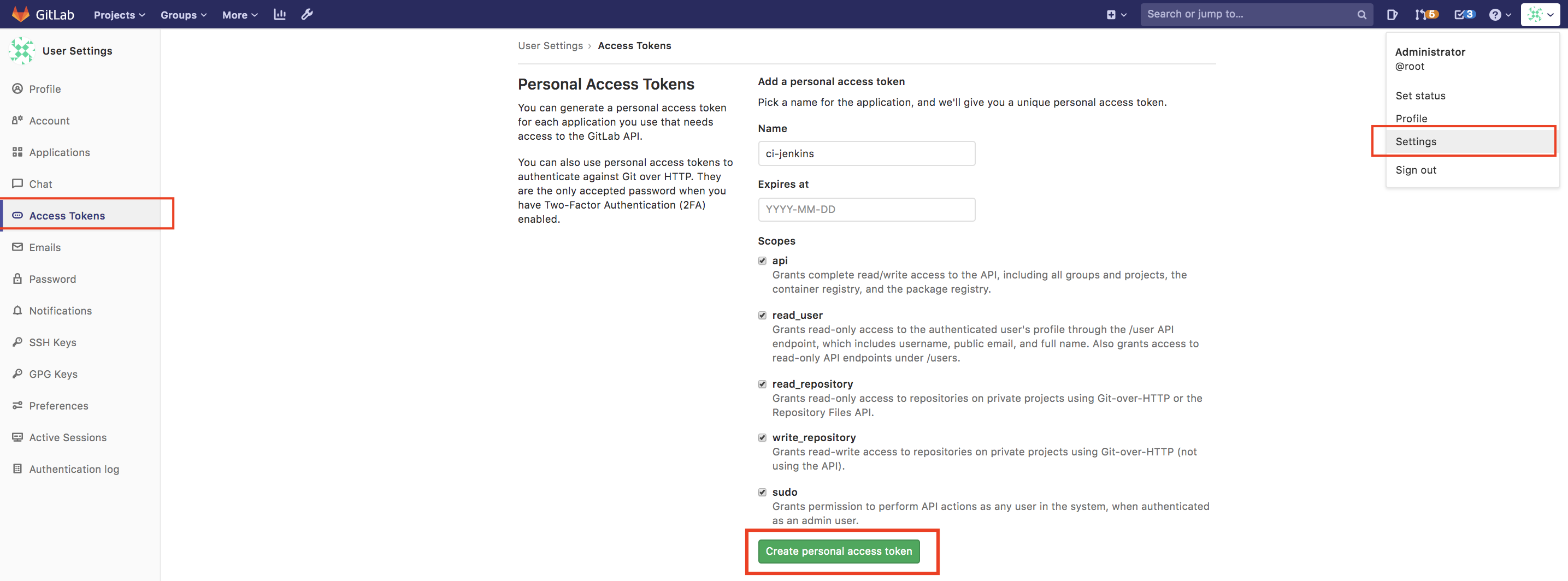在Name字段填上Token的名字,在Scope字段选上需要的权限,api的权限应该足够了。如果需要设置有效期限,可以设置Expires at字段,否则Token永不过期