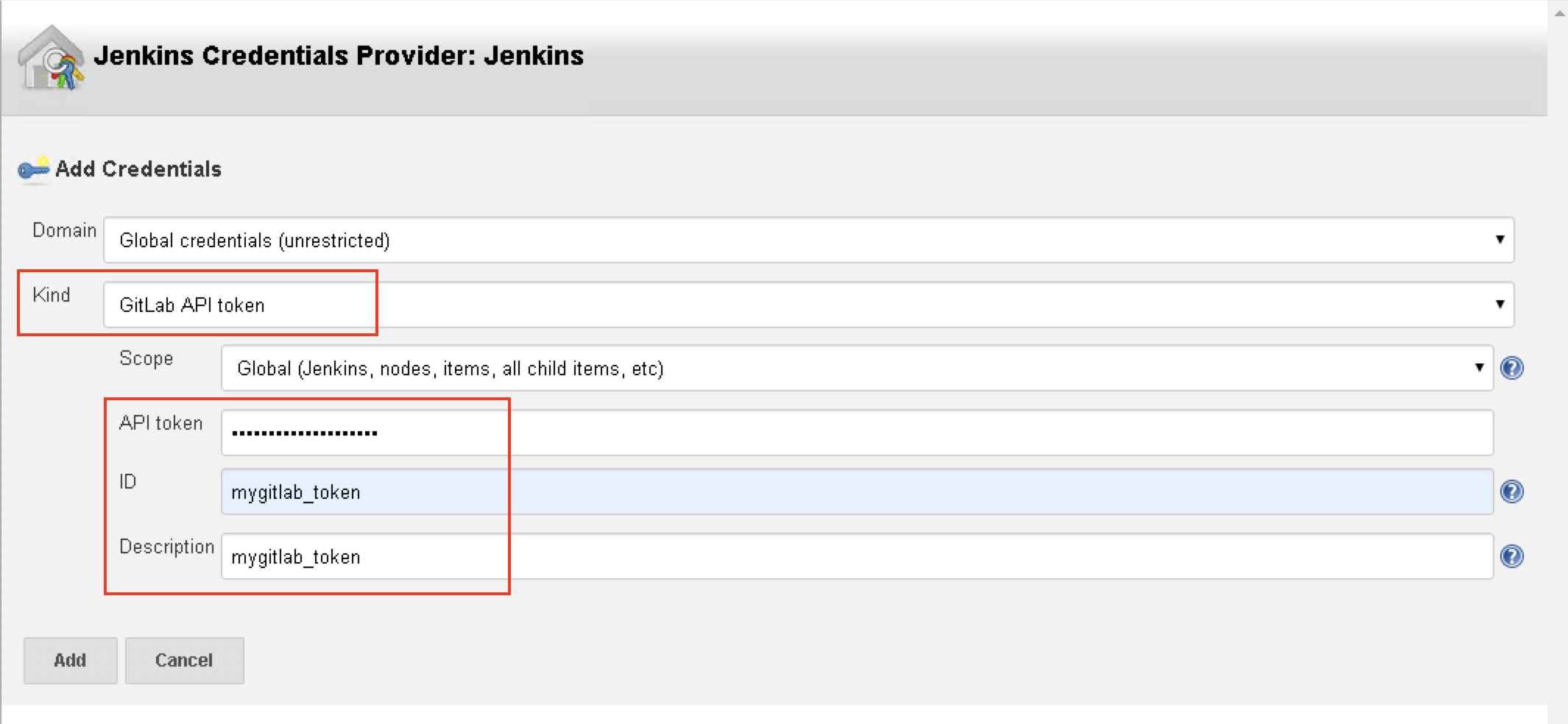 选择”GitLab API Token”类型的凭证,在API token字段里输入前面创建的Gitlab Personal Access Token,设置Token的ID和描述