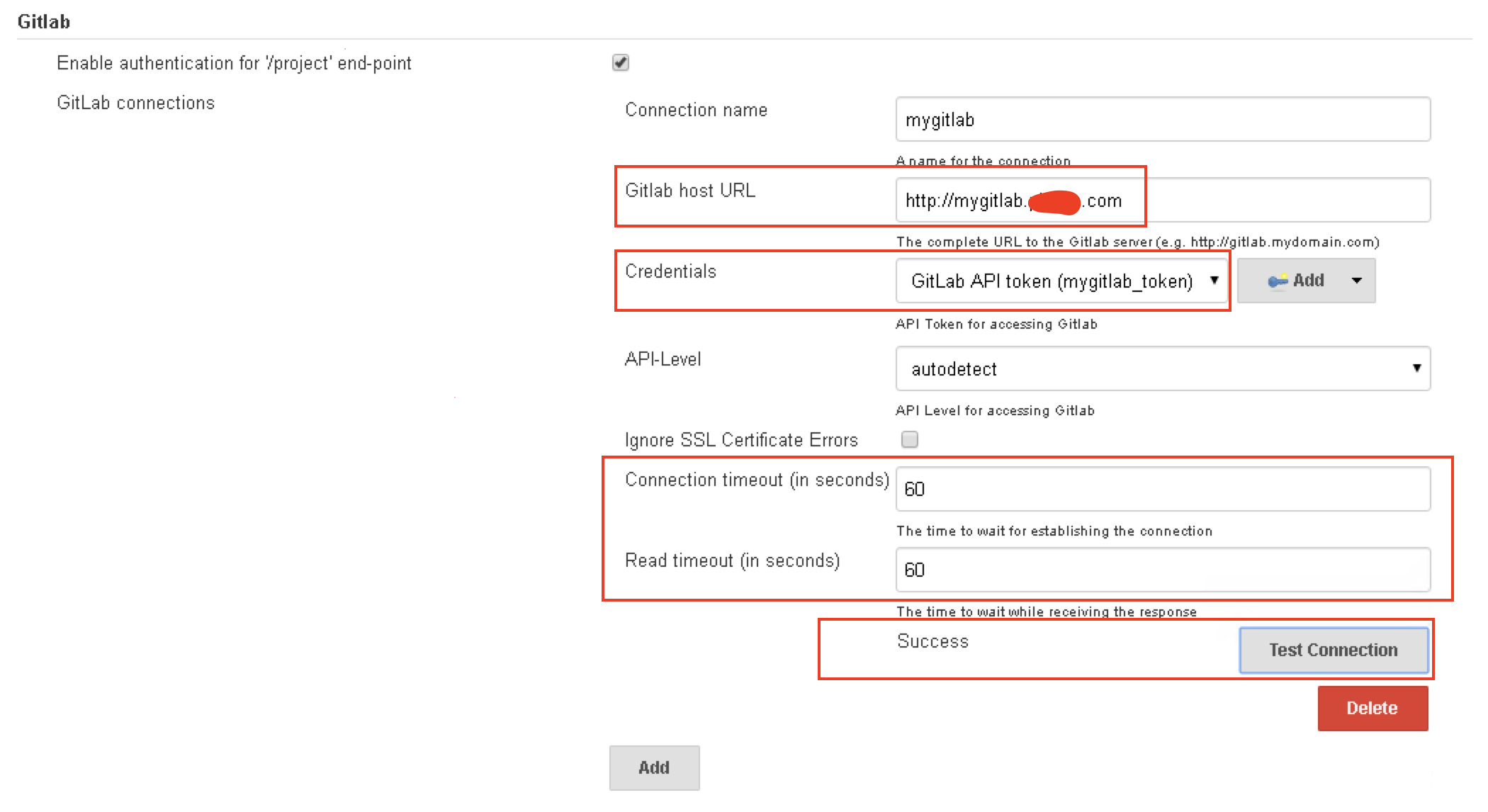 设置Connection name,Gitlab host URL,选择刚刚创建的GitLab API Token,连接和读取超时可以稍微设大一点。可以点击Test Connection测试是否能连通。