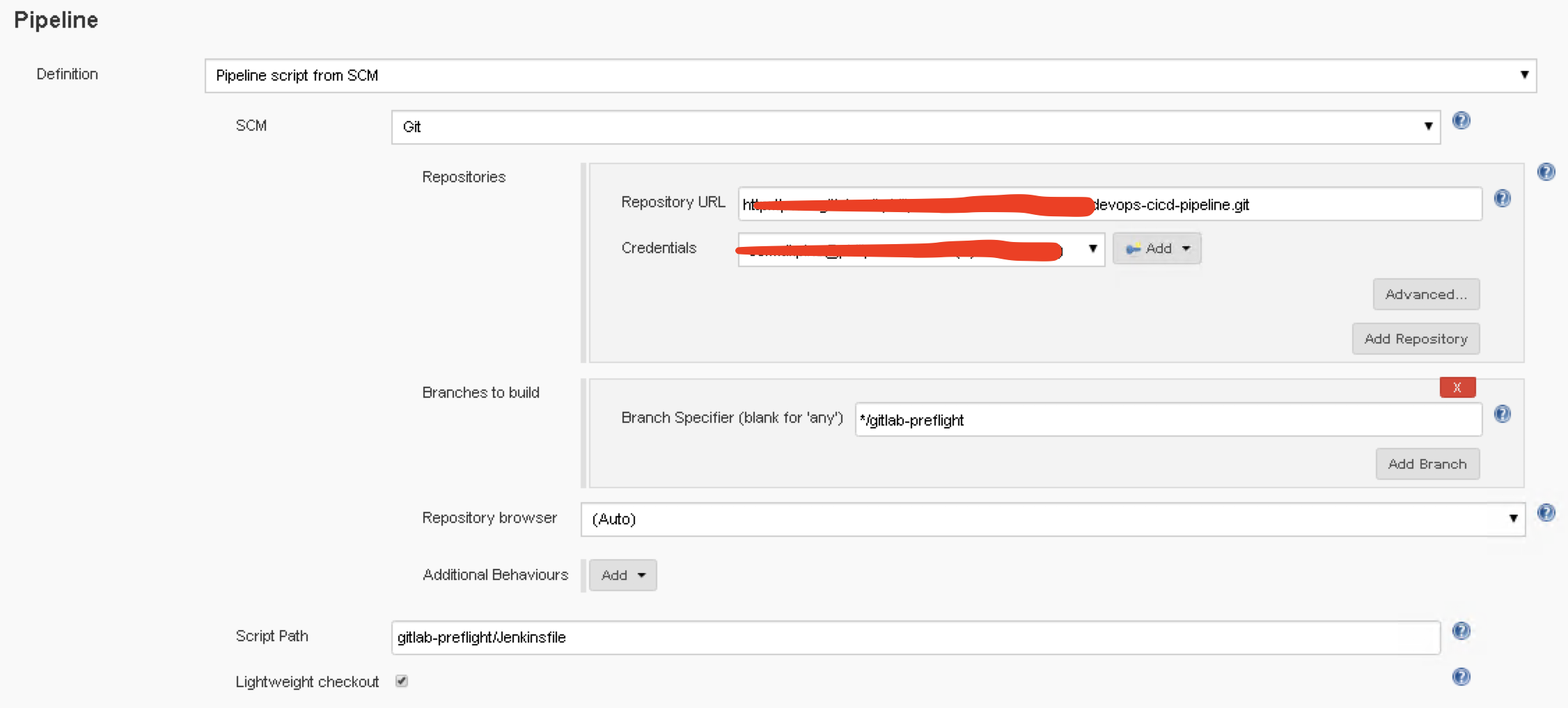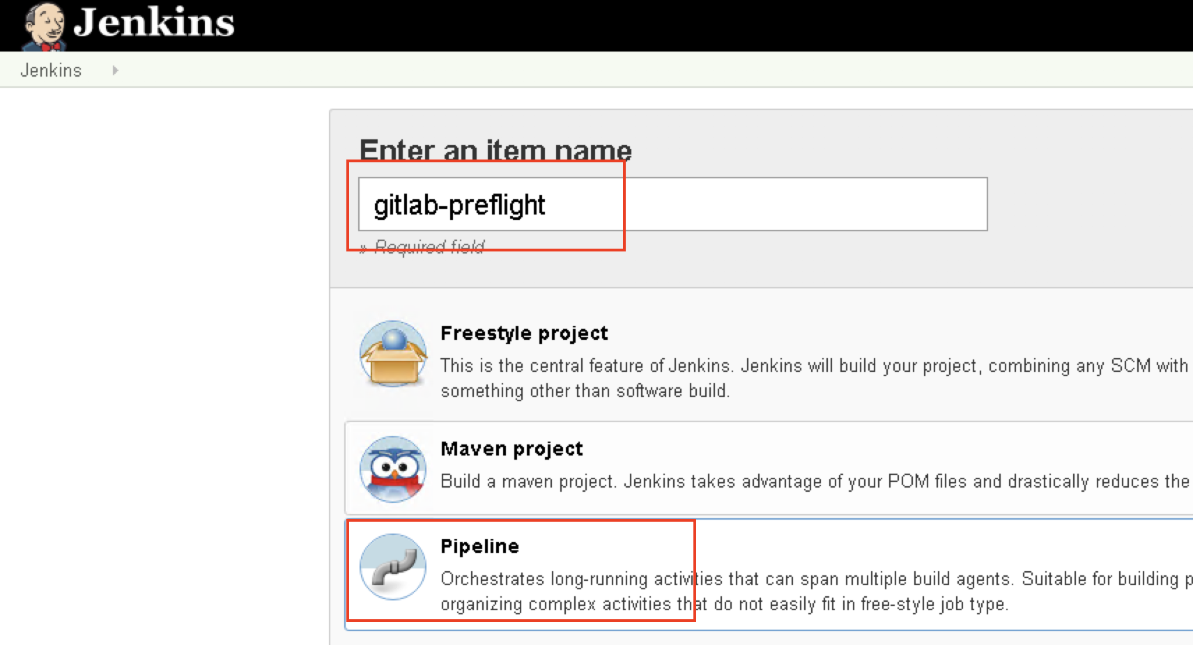 选择Job类型为”Pipeline”,输入Job的名字,比如”gitlab-preflight”,点击”Ok”按钮