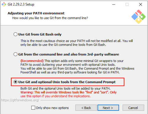 (1) 首先,在Windows系统中国安装Git时,选择”在命令提示符下使用Git和可选的Unix工具“,这样可以安装和使用很多可用的Linux命令