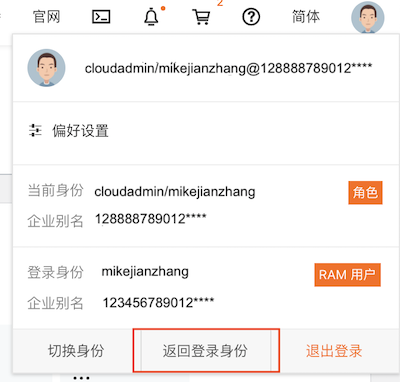 完成管理任务后点击“返回登录身份”退回到自己的账号。